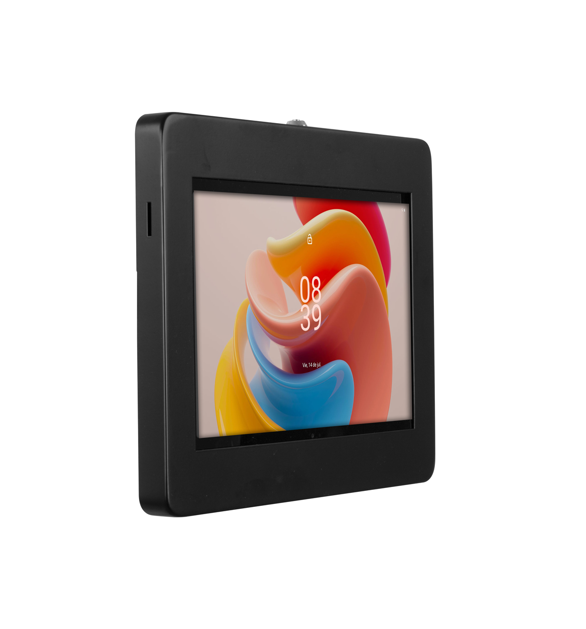 El brazo articulado cuenta con tres puntos de movimiento que permiten ajustar la distancia de la tableta respecto a la pared, con un rango de hasta 360 mm. Además, integra un canal interno para ocultar el cable de carga, garantizando una instalación limpia y estética. Su fijación se realiza mediante tornillos, con la posibilidad de montar en posición vertical u horizontal.