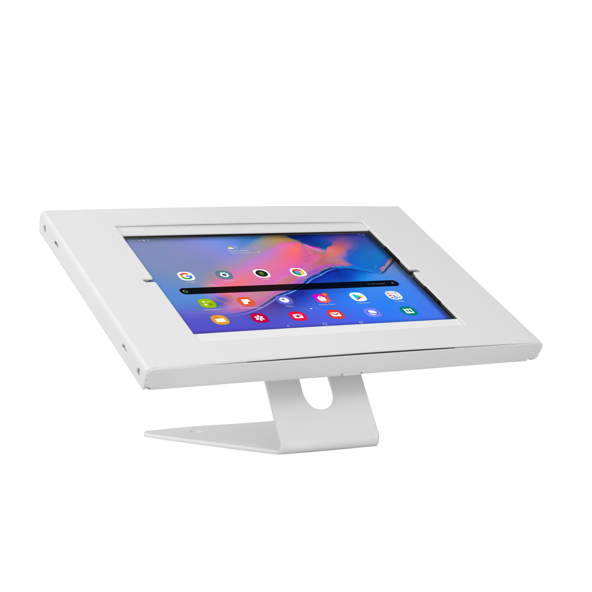 La instalación es realmente fácil y rápida, solo debes atornillar eso por ti A la mesa, atornillar la caja metálica al soporte y cerrar el cuadro con su sistema de seguridad, de tan fuerte que tú tableta permanecerá Firme y segura en los espacios públicos donde deseas instalarla, por lo que puedes estar tranquilo tu tableta no será dañada, rayada o robada.