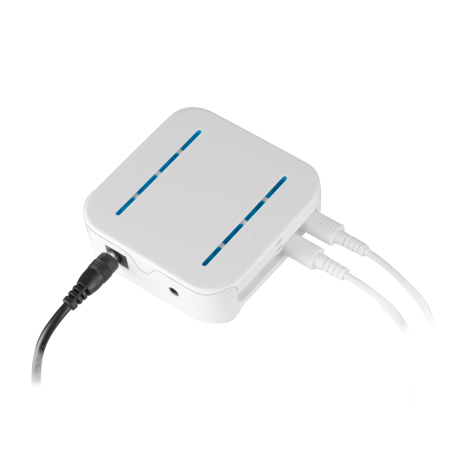 El sistema está compuesto por una unidad central con múltiples puertos USB, cada uno conectado individualmente a un dispositivo mediante un cable de 2 metros, ya sea microUSB o Lighting ( no incluídos ), garantizando compatibilidad universal. Esta unidad central es controlada por un práctico control remoto de radio de 2.4 ghz y cuenta con indicadores LED para cada dispositivo conectado.