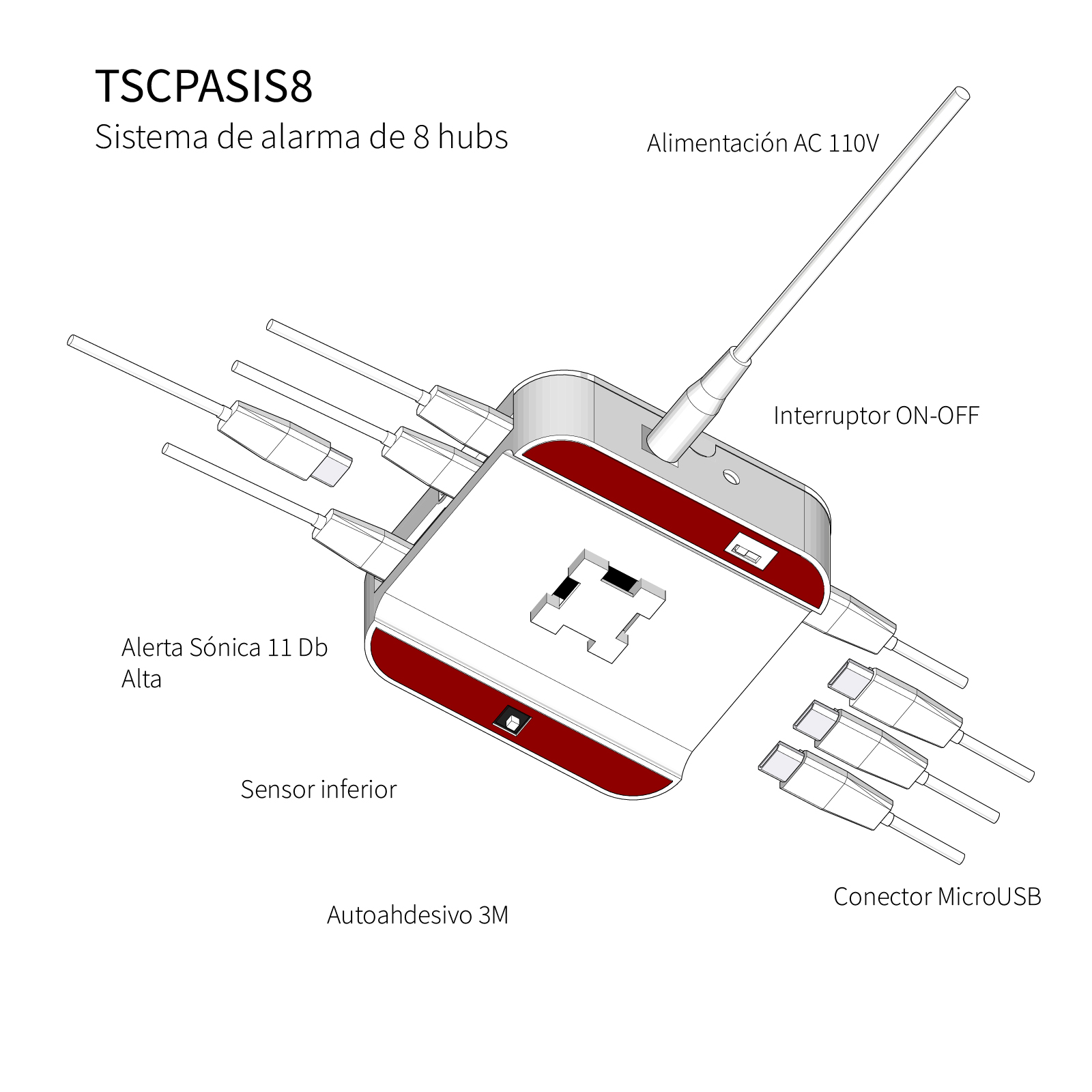 Sus características incluyen una potente salida de sonido de 120 dB, indicadores LED, capacidad de hasta 8 puertos en la unidad central, voltaje de operación de 110 V y un diseño compacto de 12 x 12 x 3 cm. Además, viene con un eliminador de baterías, interruptor de encendido oculto y cables de conexión de 2 metros para dispositivos microUSB o Lighting, ofreciendo una protección completa y versátil.