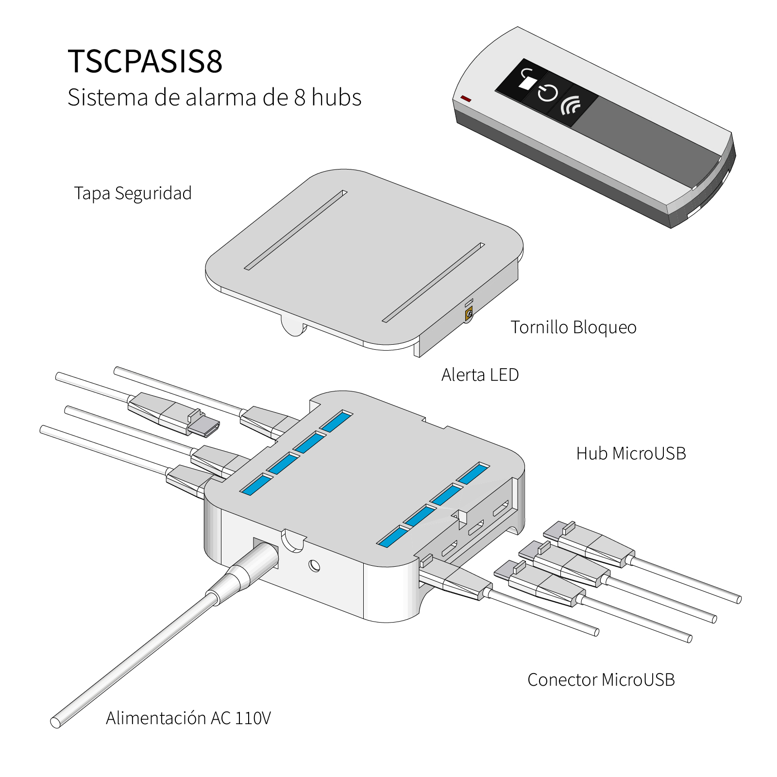 TSCPASIS8 sistema de alarma modular para proteger smartphones, tabletas y gadgets es un avanzado sistema modular de seguridad antirrobo con alarma diseñado para proteger gadgets, smartphones y tabletas de manera efectiva. Este innovador módulo cuenta con un control remoto que activa la alarma en caso de intento de robo. Ideal para proteger iPhone, smartphones, tablets, reproductores de MP3, GPS y más, es perfecto para su uso en mesas de exhibición, tiendas, exposiciones y mostradores de celulares en autoservicios.