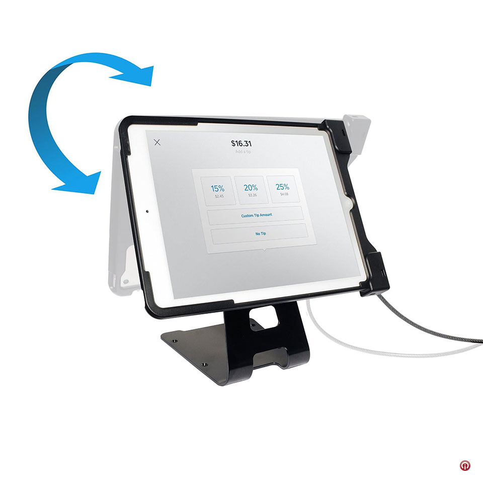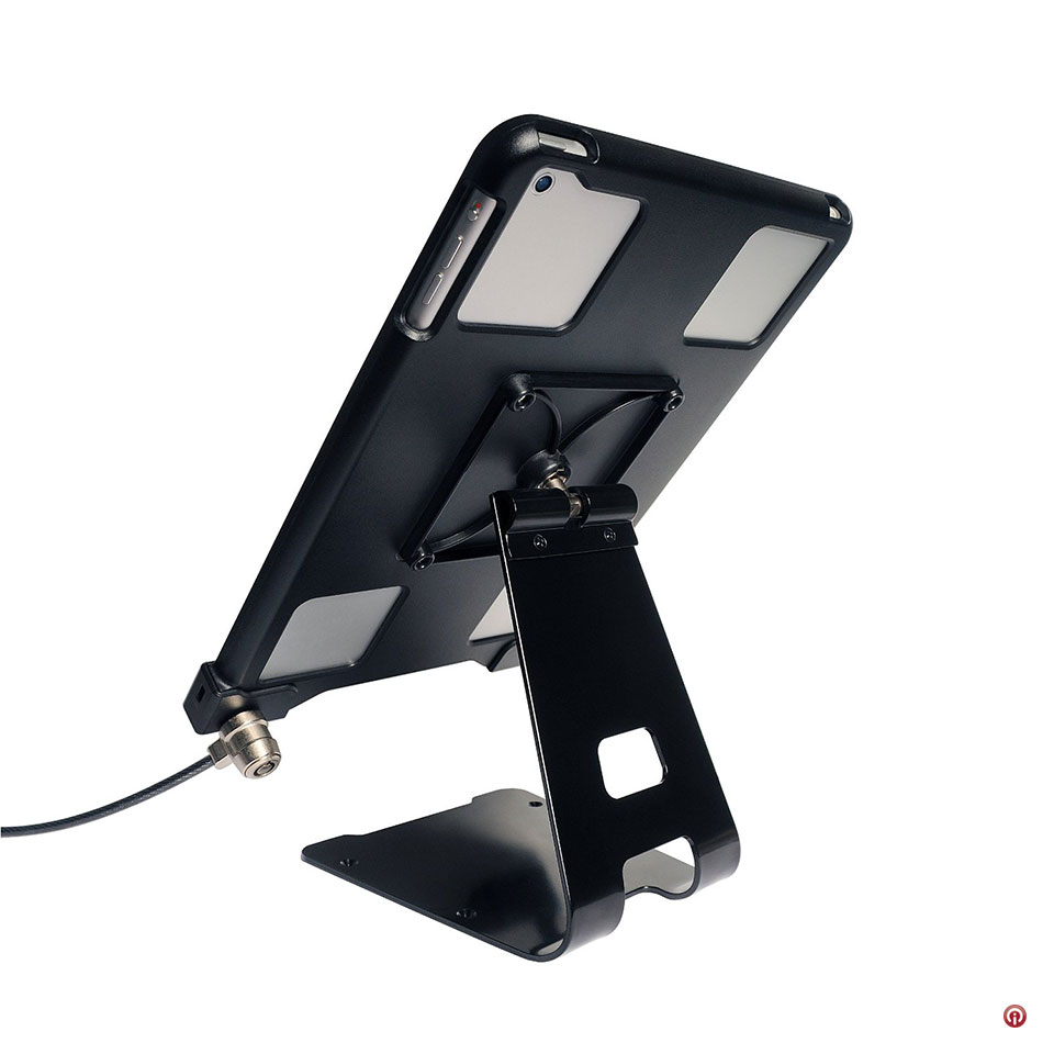 Base de exhibición cuadrado tipo funda para protección de iPad de 9.7” versátil en todas las situaciones con exhibición en áreas concurridas por público. Protección sin limitar la accesibilidad y funciones del iPad, sin obstrucciones para los puertos y botones. Conveniente para instalar dispositivos de cobro con tarjeta.